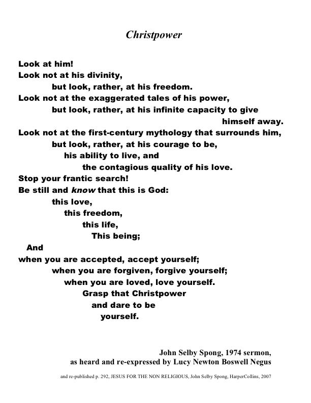 John Shelby Spong’s own upbringing was very “biblical.” In the course of his life, he says, his Christianity has been transformed, and clearly the power of Jesus in his life remains strong. My single most powerful moment last week came with the reading of Spong’s epilogue, “Christpower.” Here’s the poem expressing his core religious belief: